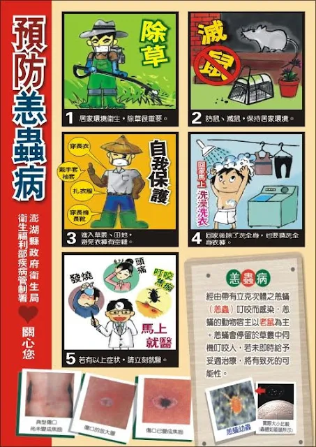 恙蟲病是經由帶有立克次體的恙螨叮咬而感染;恙螨會停留於草叢中,伺機攀附到經過的動物或人類身上,因此行經草叢且未做好保護措施,極可能遭恙螨叮咬而感染。恙蟲病的潛伏期約9至12天,患者會出現持續性高燒、頭痛、淋巴結腫大等症狀,約發燒一週後皮膚出現紅斑狀丘疹,恙螨叮咬處通常會出現無痛性焦痂,如未經妥適治療死亡率可達60%。
