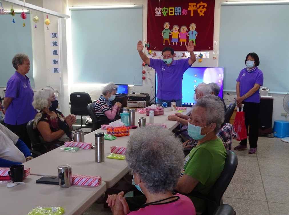 望安日間照顧中心關懷服事老人,啓明長老教會劉堅望牧師講道「父親的愛」;黃美惠牧師娘帶動樂齡福音分享會的阿公、阿嬤,高歌「無限的愛」、「耶和華祝滿滿」等,把歡樂帶給大家。
