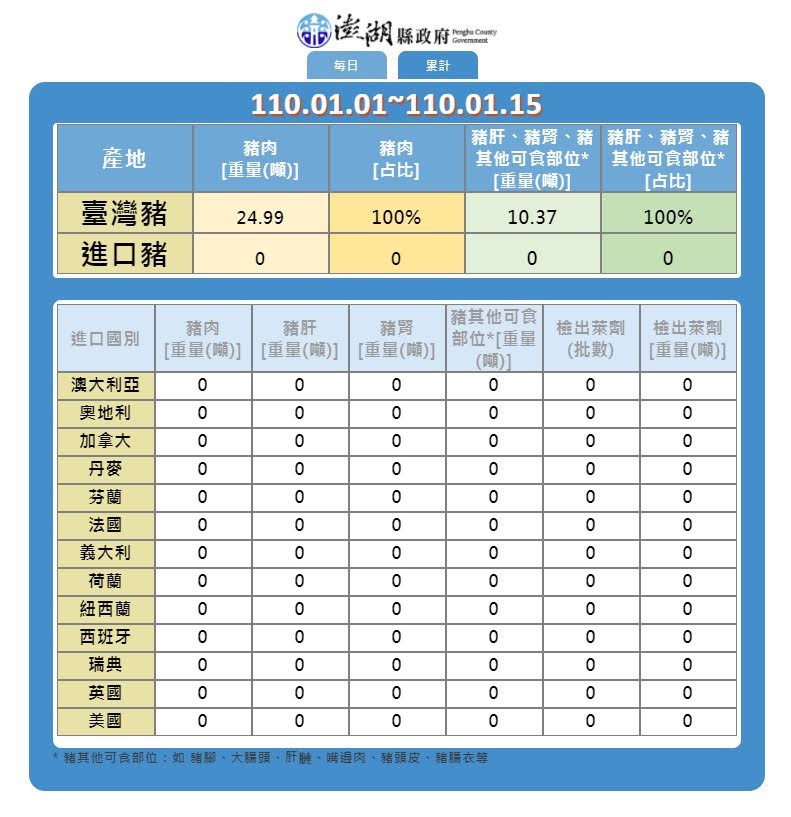 根據澎湖縣政府衛生局統計,自109年元旦至今(元月十五日),澎湖總共輸入25噸台灣豬肉、10.4噸台灣豬內臟及其他可食部位(如附表所示),沒有進口豬肉及內臟進入本縣。