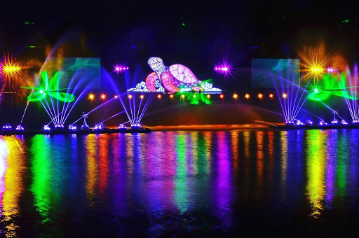 水舞表演自7點20分開始,每半小時展演一次至晚上10點,獨特的展演圖形,結合璀璨幻彩水舞、高科技投影、大型福龜藝術裝置燈光秀,搭配高科技燈光雷射及音響特效,精采奪目的聲光展演。