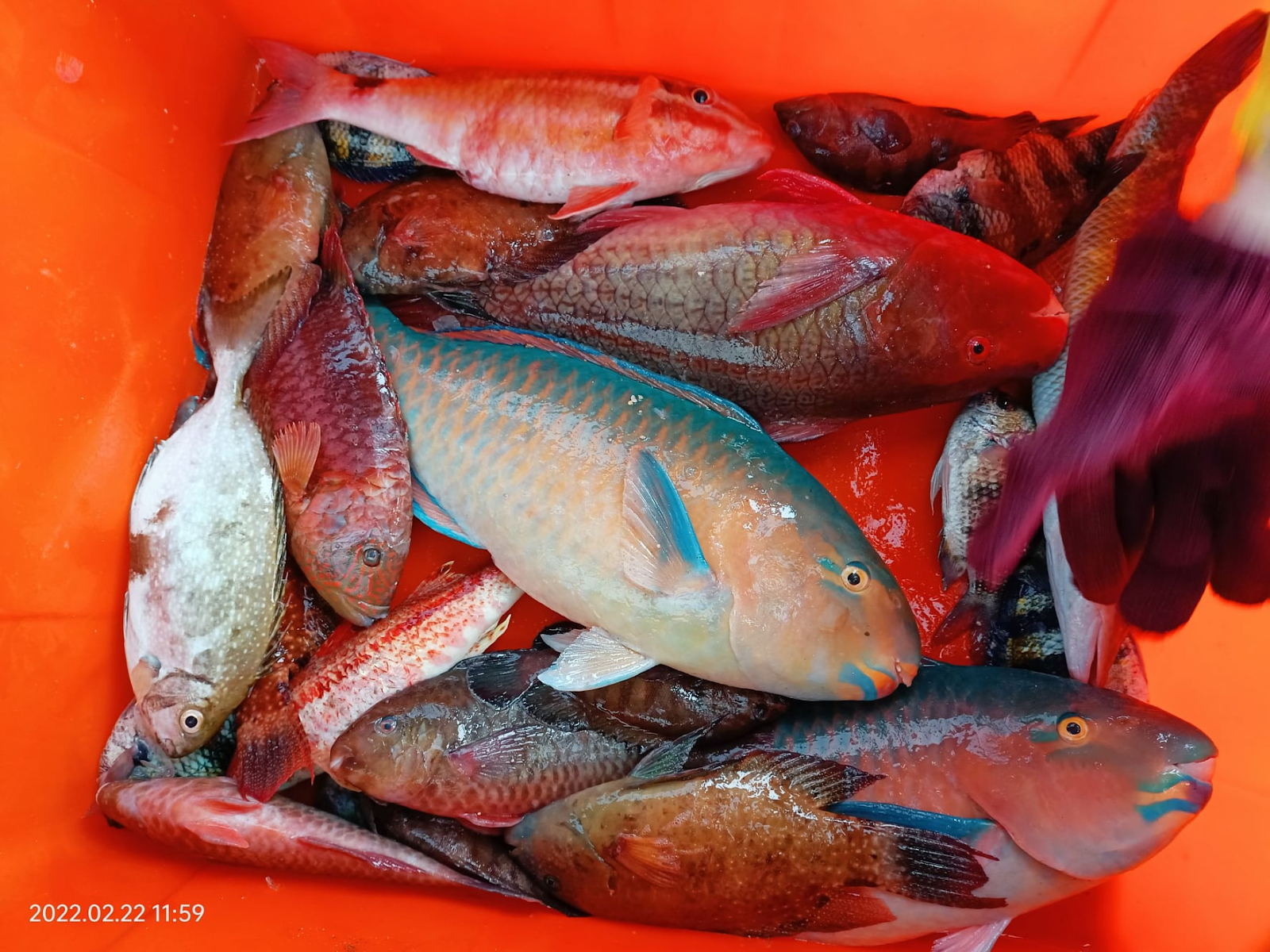 魚兒受凍消息一傳十、十傳百,許多民眾聞訊,也顧不得寒風驟雨,趕忙拿著手撈網,前往合界沙灘撿拾打撈;現場多數魚兒皆為凍傷,新鮮度堪比現釣活魚,其中不乏石斑魚、鸚哥、雀鯛、火斑笛鯛等高經濟魚種,體型從1台斤至2公斤不等,民眾收獲滿滿,滿心歡喜地將魚兒帶回家飽餐一頓。