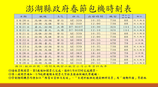旅遊處表示,本次鄉親登記需求數較往年降低,受理約1,000人次,其中登記人數以高雄航線較高來回共564人次、臺北航線次之來回共300人次、臺中航線來回合計不足50人次,故本次縣府共增開台北航線3班、高雄航線4班計7航班,其中5航班以小換大增加機位及2航班ATR包機方式,來回共提供1,212座位數,並於1月3日起通知開票,請接獲通知民眾儘速於開票期限1月6日中午12時前完成購票。另華信航空主動於20日至29日春節期間調整放大機型,目前部分時段仍尚有空位,有搭機需求鄉親逕上華信航空銷售通路訂位購票。