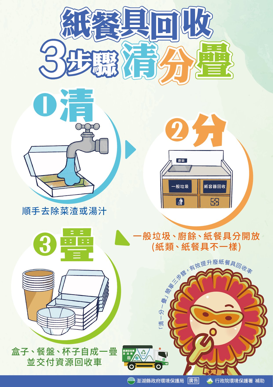 澎湖縣政府環保局提醒自助餐店及便當店應設置廢紙容器(餐具)回收設施及標示,如店家未沒有依規定設置,將依廢棄物清理法處新台幣6萬至30萬罰鍰;並鼓勵民眾用餐後落實廢紙容器(餐具)「清、分、疊」回收三步驟,共同提升廢紙容器(餐具)回收成效,以呼應SDG12促進綠色經濟,確保永續消費及生產模式的永續目標。