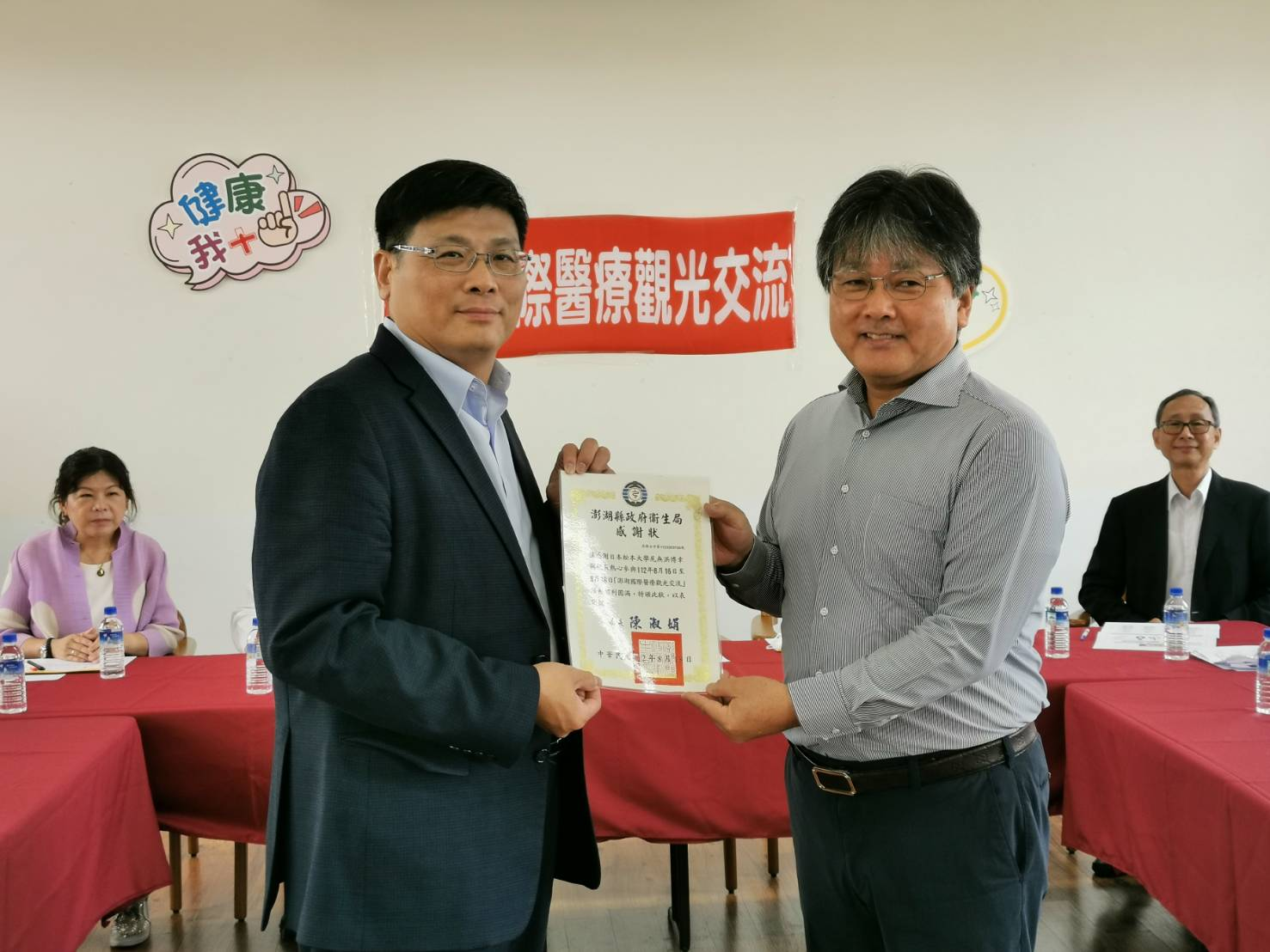 本次交流活動也為澎湖地區的國際醫療觀光合作奠定了更堅實的基礎。除了,第一天,四季常照養護中心、部澎外,昨天由副縣長林皆興、衛生局長陳淑娟及相關同仁等陪同到菓葉健康園區,參訪心理衛生中心、日照中心、復健中心,然後作座談會,分享觀光、地域振興、福祉社會與地域防災的對策,看菓葉關懷據點的老人共餐,參訪社區。