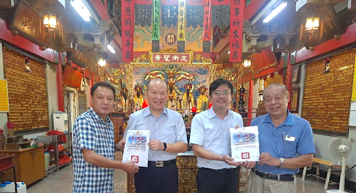 △莊敏宏董事長(左一)、顏嘉禾校長(左二)、陳三家董事長(右二)、陳滿富副董事長(右一)在高吉武聖殿特募集600公斤白米給澎湖海事。(嚴光澎攝)