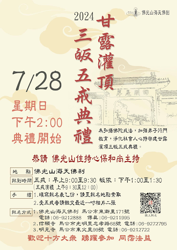 「三皈五戒」並非口號或是形式,而是要將佛法解行並重的運用到生活中,星雲大師所提倡的「人間佛教」就是要大眾在生活中修行。甘露灌頂三皈五戒典禮,皈依、新戒、複戒皆可報名。報到時間:五戒:上午九時(演禮);皈依:下午一時。報名地點:佛光山海天佛剎,馬公市東衛里 171 號;電話:9212888。