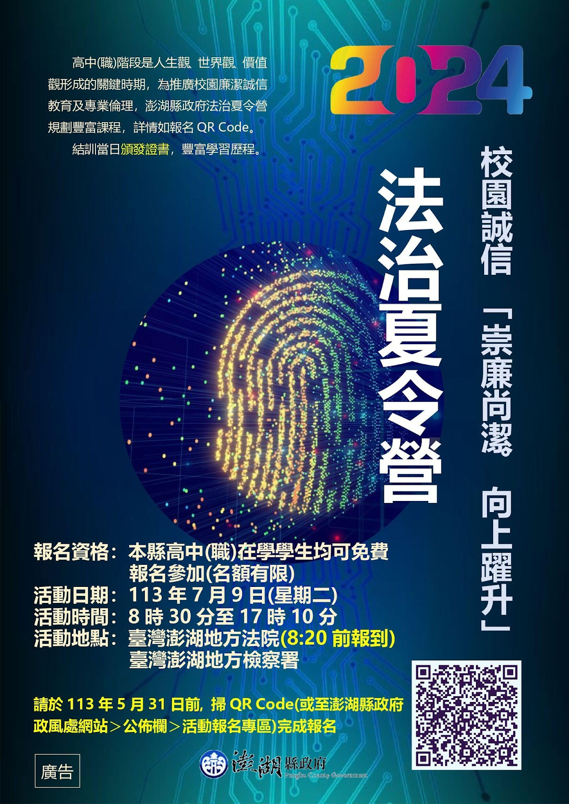 縣府政風處更跨海邀請了內政部刑事警察局的鑑識專家呂政鴻帶領學子們一窺鑑識科學的奧秘,呂政鴻講師承辦過多起台灣重大鑑識案件,其中最為人知的是110年臺鐵太魯閣號脫軌事故及罹難者遺體鑑識工作,呂講師帶領鑑識團隊在事故現場尋找大體及分散四處的殘肢,並於隧道口外尋獲關鍵證物(1公分大小的列車自動防護系統記憶卡),還原事發經過替罹難者找回真相,還因此榮獲警政署111年度全國模範警察的殊榮,透過本次法治營讓學員們了解鑑識領域、人生應有的誠信態度及專業倫理,不僅豐富本次課程內容,也能增廣學生的視野,有利未來升學發展。