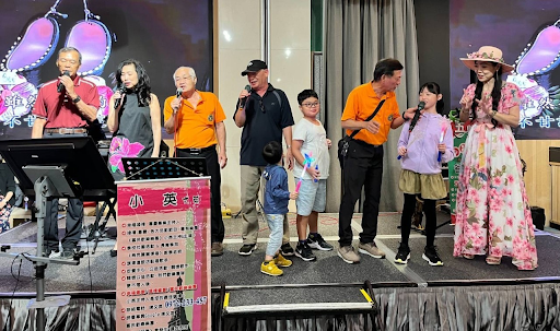 △高雄市澎湖趙氏宗親會理事長趙聰前夫婦大家聚到一起,現場卡拉OK歡唱氣氛嗨到極點。(嚴光澎攝)